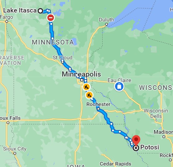 By my calculations and estimates, I’ve put in 455 miles since we started our challenge last October. And that’s roughly the equivalent of going from Lake Itasca, where the Father of Waters starts in Minnesota, all the way to Potosi, Wisconsin! Home of the National Brewery Museum and two of my friends from high school. We spent some time together there this June. But that’s another post.