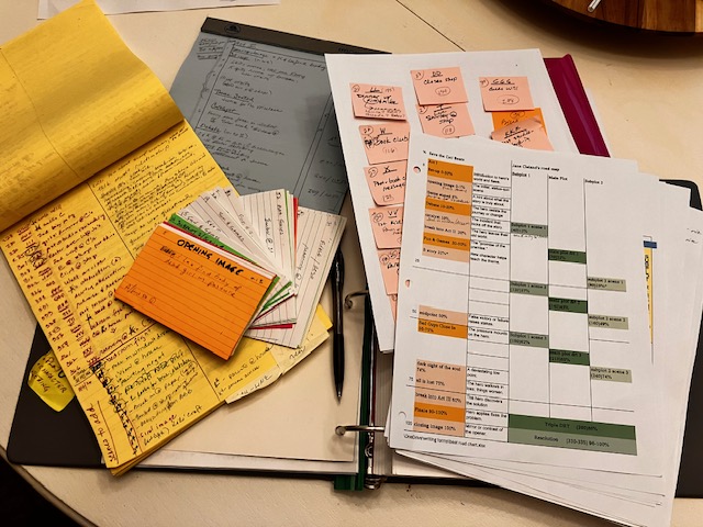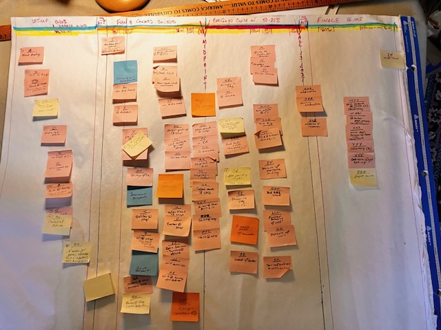 About 20 hours of the time I’ve spent has been playing with different methods of reorganizing my plot without actually getting the job done. It’s been a sometimes frustrating, sometimes tedious, and often colorful process as I tried various methods of reordering my scenes. I’ve dug out old easel-pads, notecards, flags and highlighters, not to mention pens with a variety of ink colors. I’ve also tried Excel forms and Photoshop image editing.