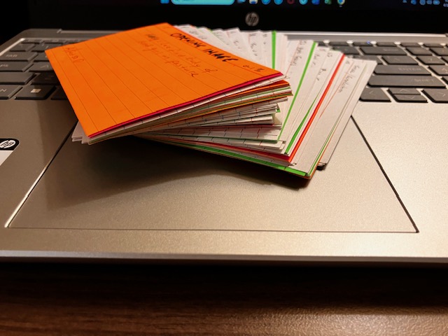 Until I started re-reading the 360-plus pages of my 2022-23 draft of my 2020 NaNo novel, I’d been focused on words, not the bigger picture. Oh, I still like my opening scene. That won’t change much because I know it’s where the story starts. It’s a murder mystery, after all, and you need somebody to find a body fairly early. But last time I read it was when I took Jim’s Guppy class, and I knew a big volunteer project would keep me from really focusing on the class and its homework. I have never been gladder for saving my notes!